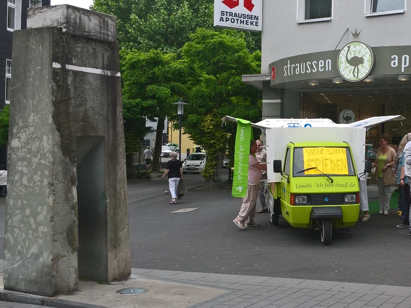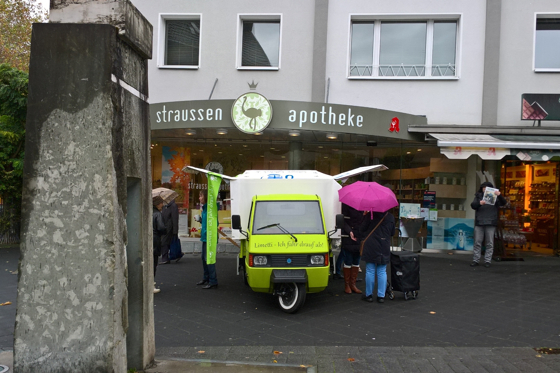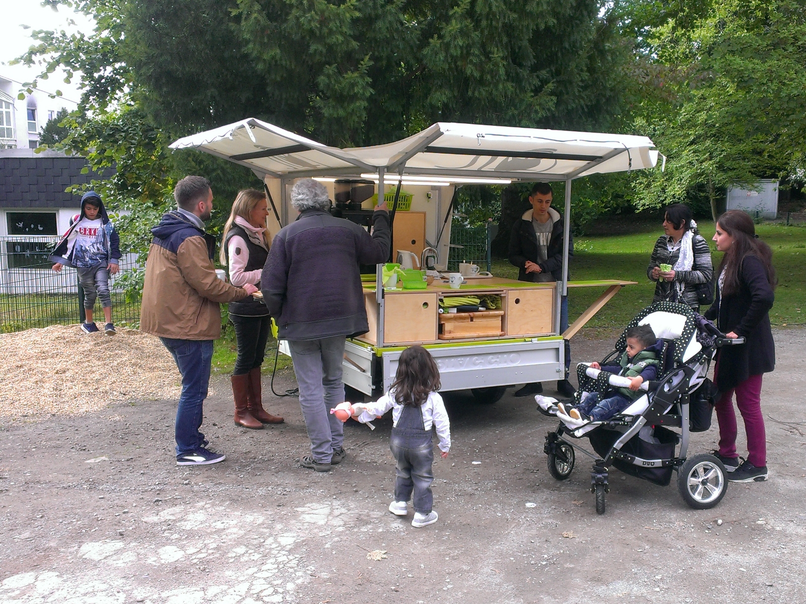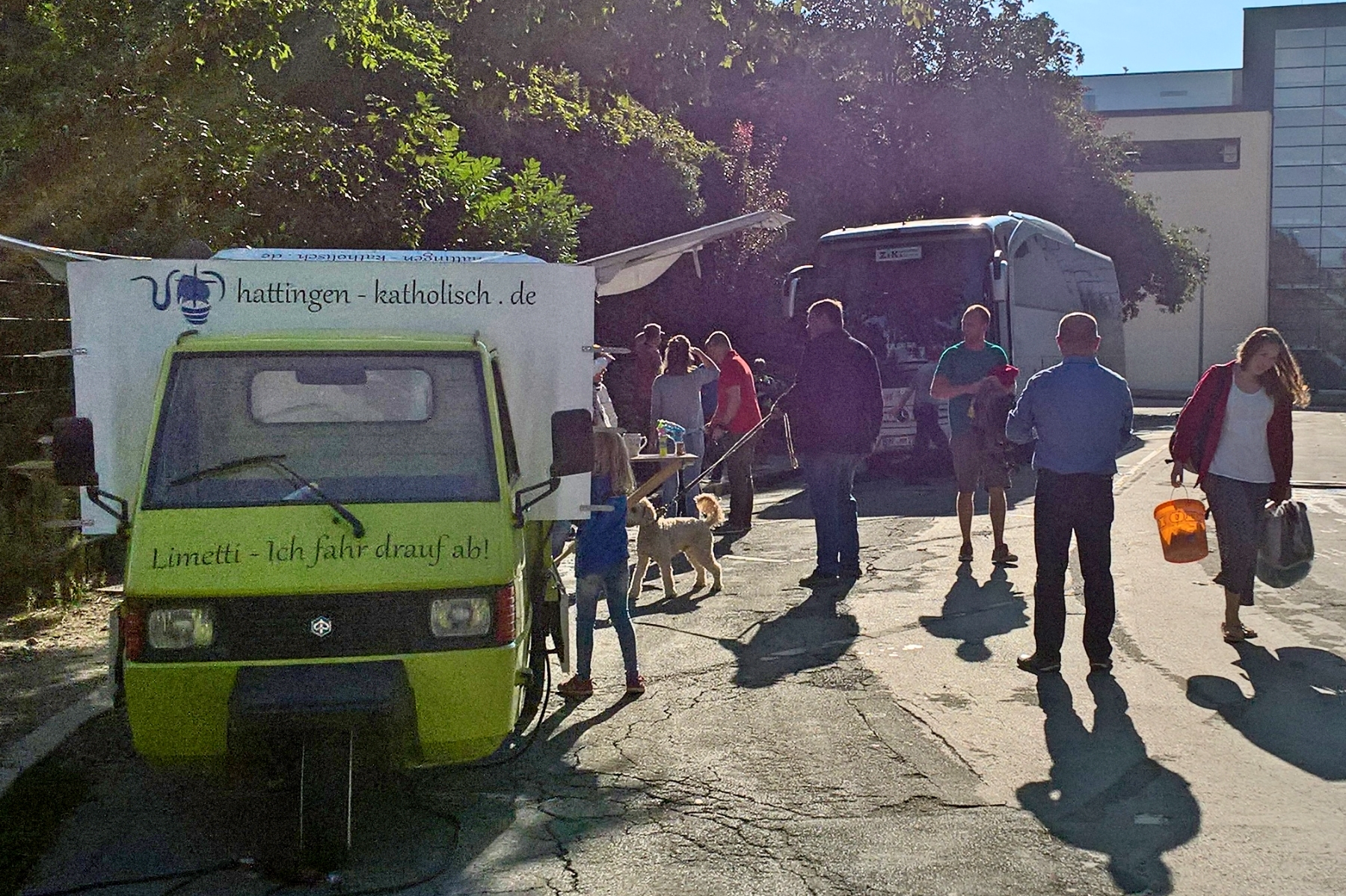 • eine Gruppe von Menschen, die mit der Ape und der Kaffeemaschine herausfahren.