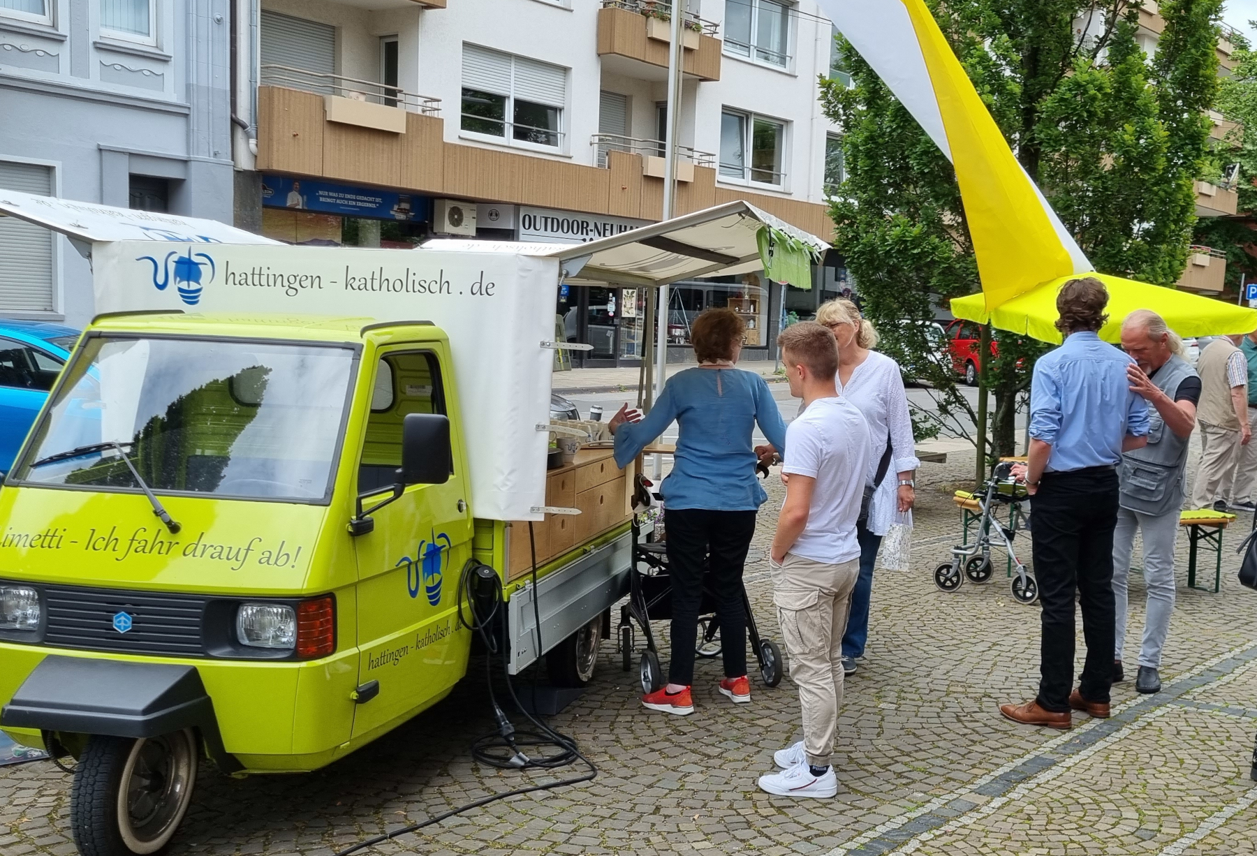 • eine Gruppe von Menschen, die mit der Ape und der Kaffeemaschine herausfahren.