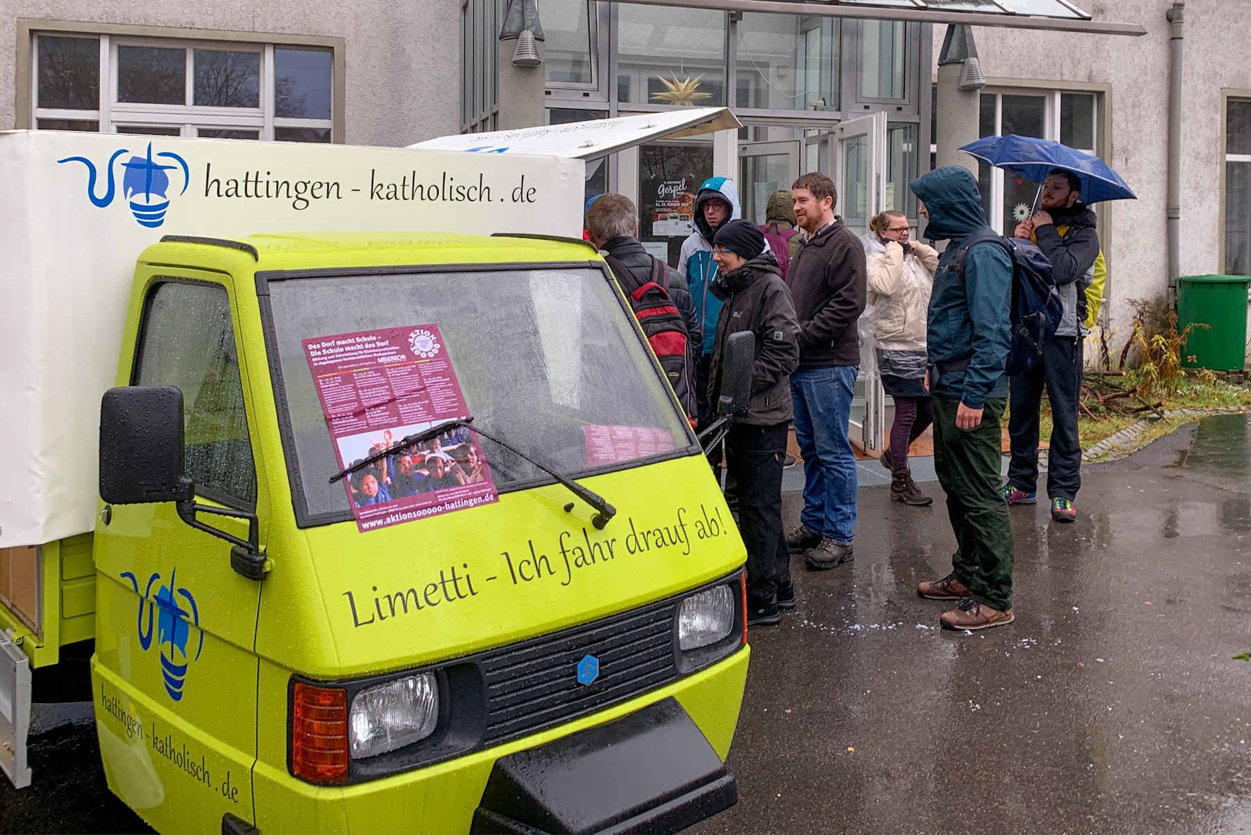 • eine Gruppe von Menschen, die mit der Ape und der Kaffeemaschine herausfahren.